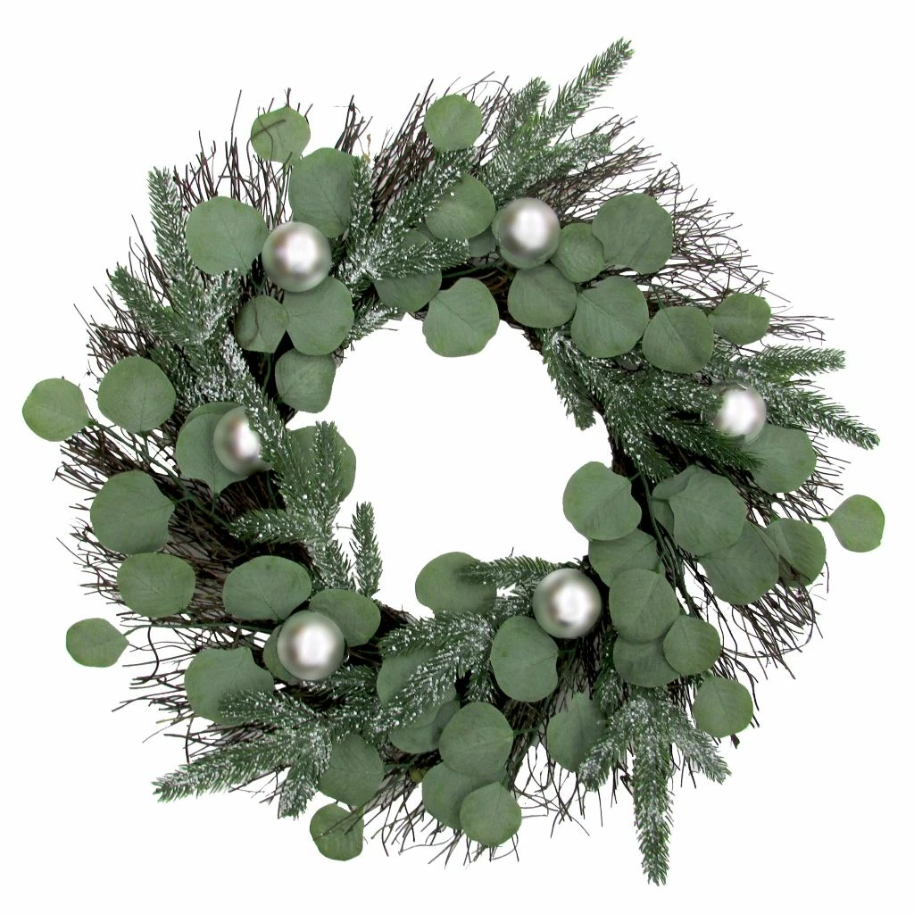 - Life-like eucalyptus leaves and shatterproof ornaments adorn a twig wreath base