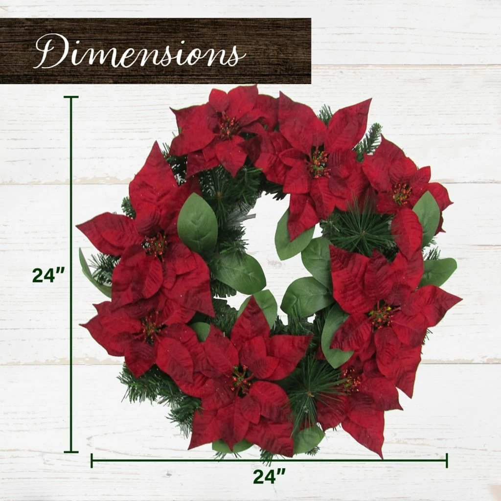 - Durable faux greenery with velvet poinsettia flowers