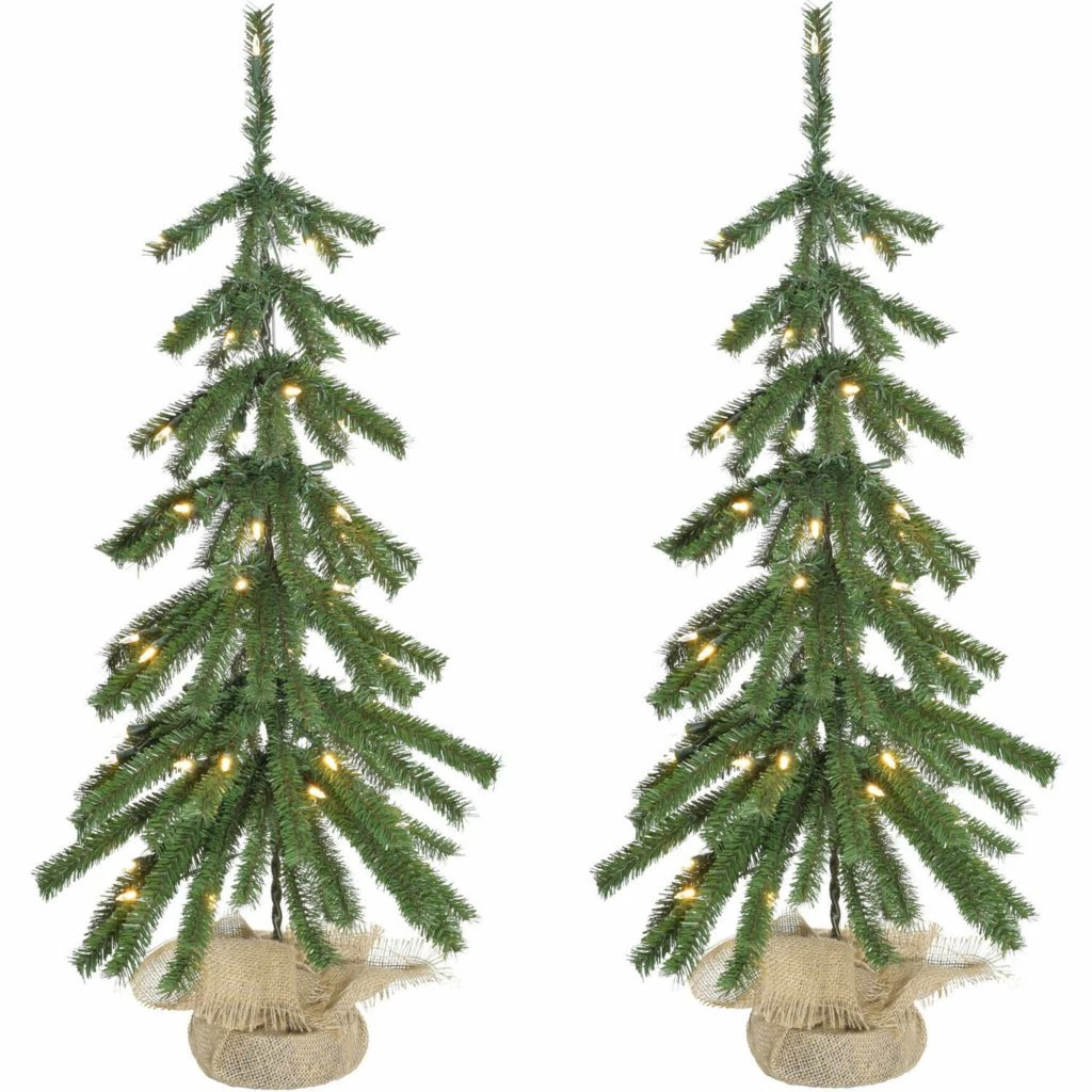 Fraser Hill Farm 3 ft. Downswept Farmhouse Fir Christmas Trees with Burlap Bag, Warm White LED Lights, Set of 2, FFFF036-5GR1/S2