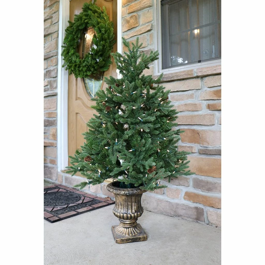- 4 ft. fir tree includes metallic urn to secure the tree into