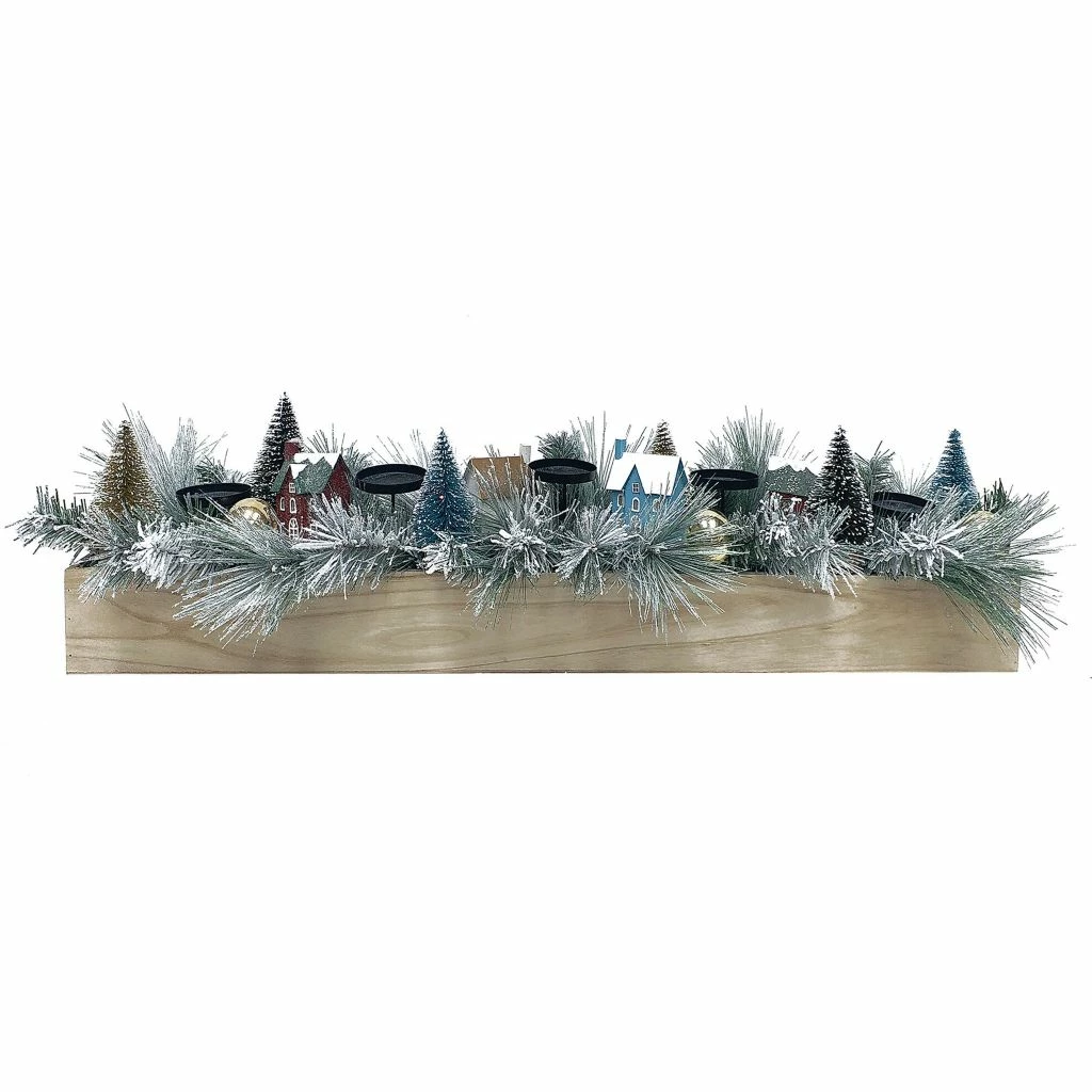 Fraser Hill Farm 42 in. 5-Candle Holder Centerpiece, Frosted Branches, Bottlebrush Trees/Houses, Wooden Box, FF042CHTT007-0MLT