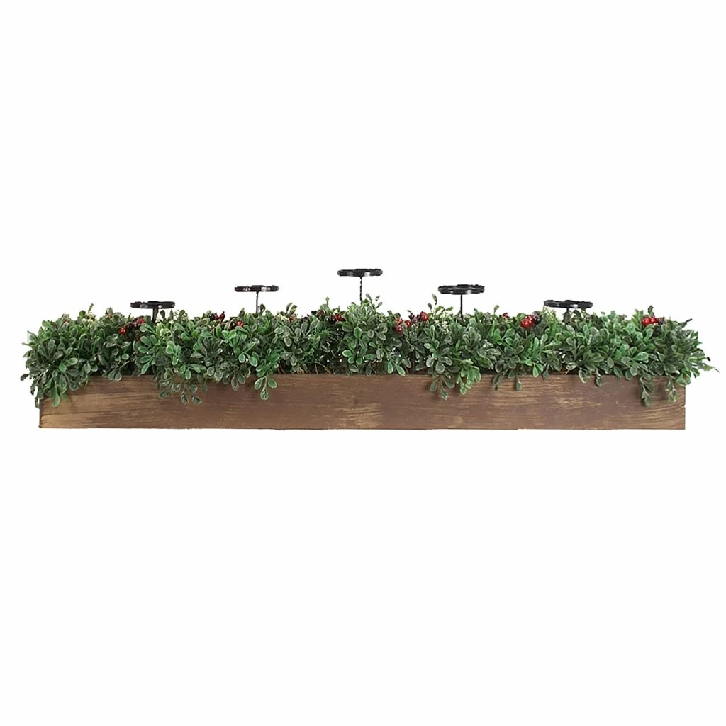 Fraser Hill Farm 42 in. 5-Candle Holder Centerpiece w/ Boxwood Greenery and Red Berries in Wooden Box, FF042CHTT002-0GR