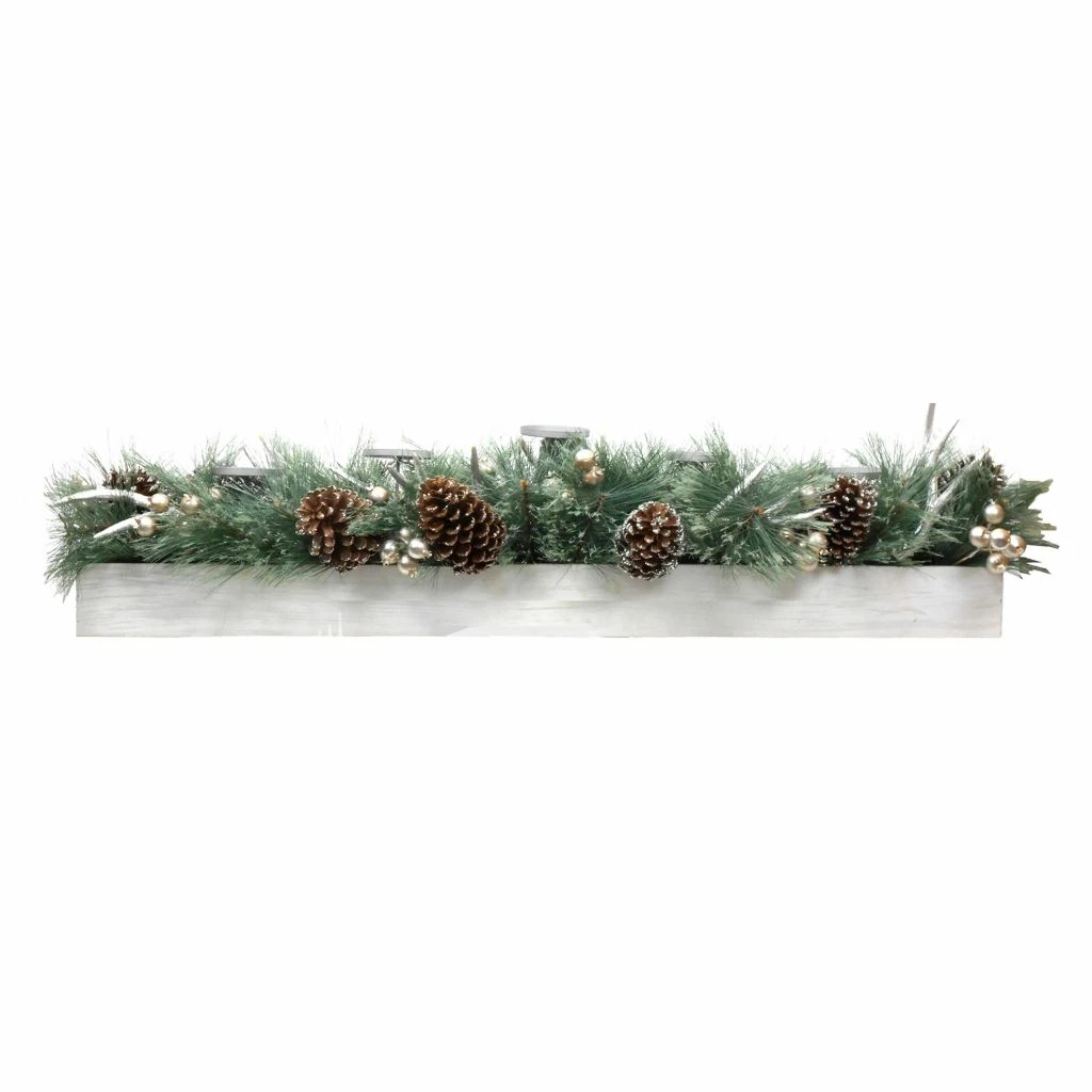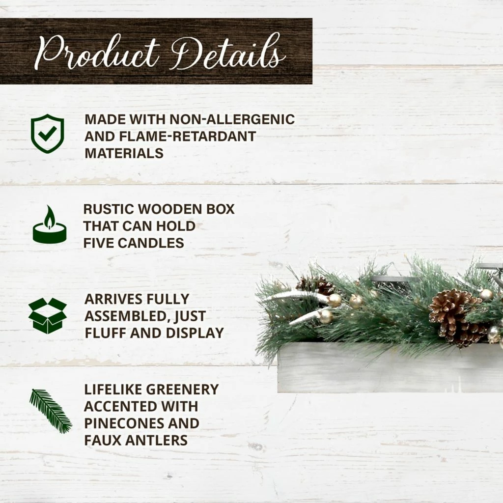 Fraser Hill Farm 42 in. 5-Candle Holder Centerpiece w/ Greenery and Pinecones w/ Antlers in Wooden Box, FF042CHTT001-0GR