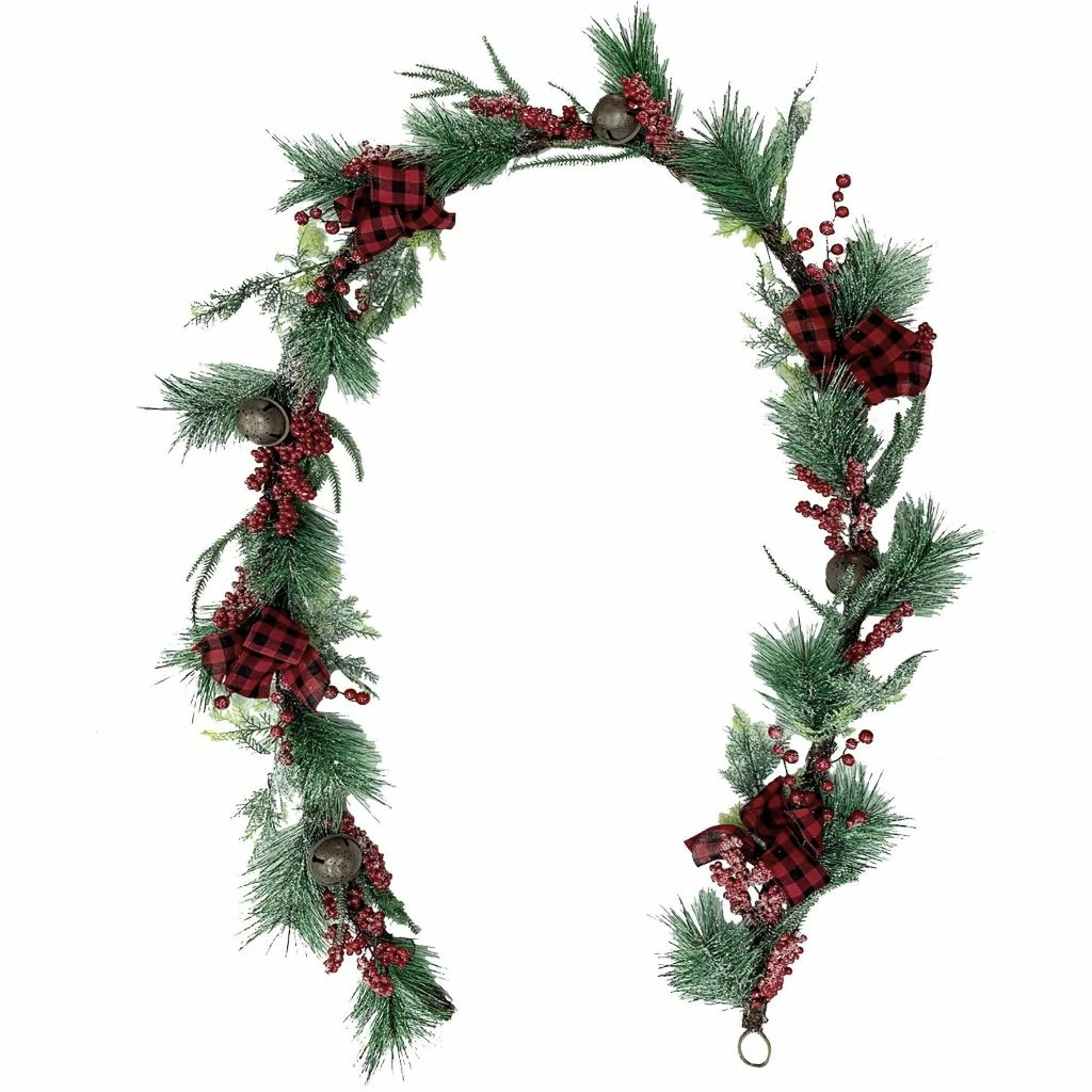 Fraser Hill Farm 9 ft. Frosted Christmas Garland with Red Berries, Plaid Bows, and Rustic Sleigh Bells, FF108CHGL008-0GR