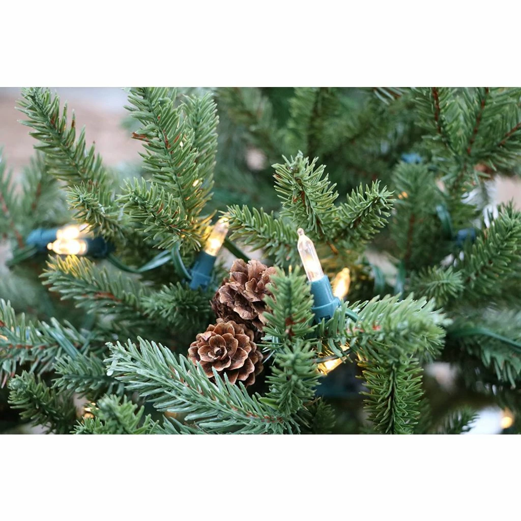 - Each artificial fir tree features 303 tree tips with 28 miniature pine cones and 200 LED bulbs scattered throughout